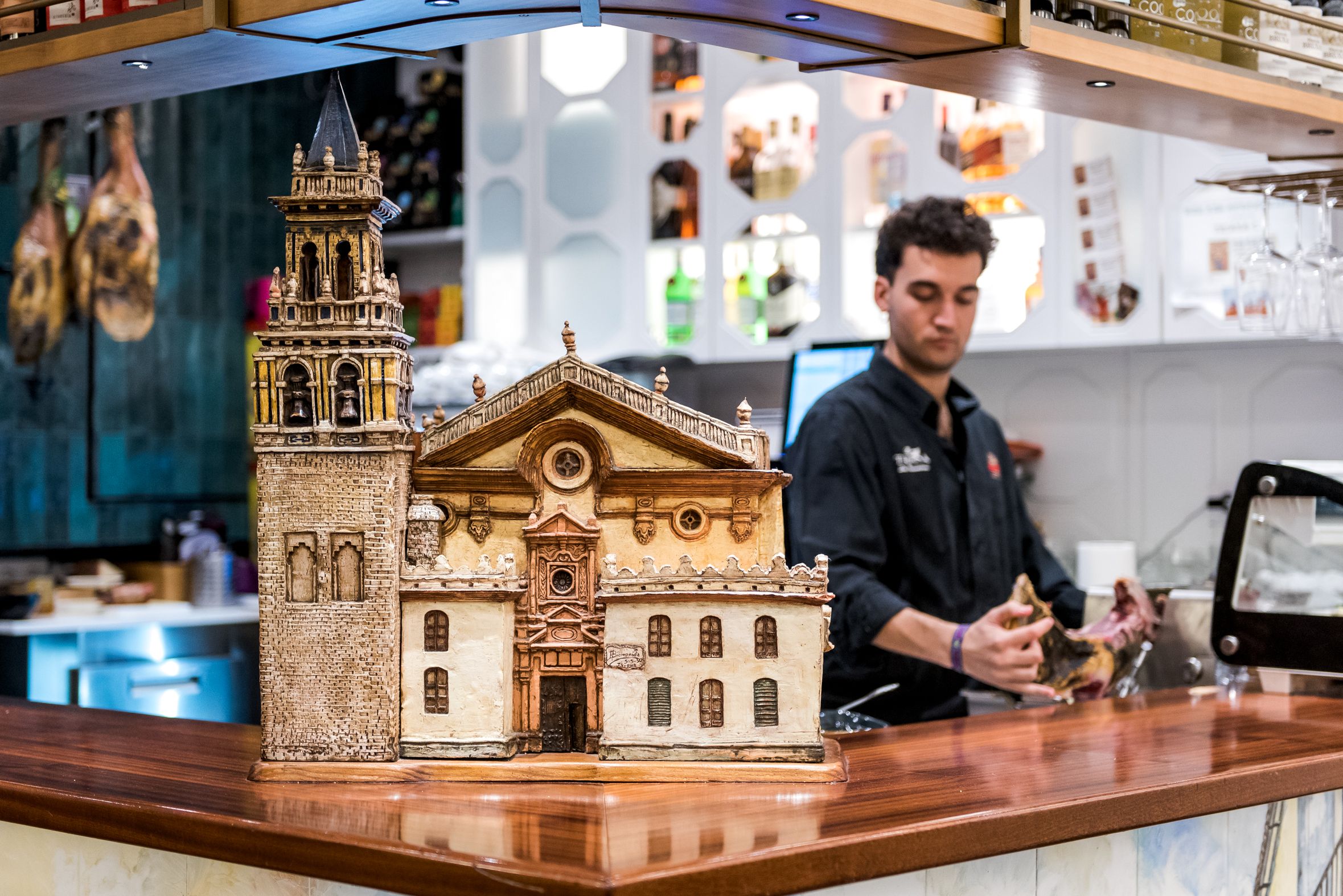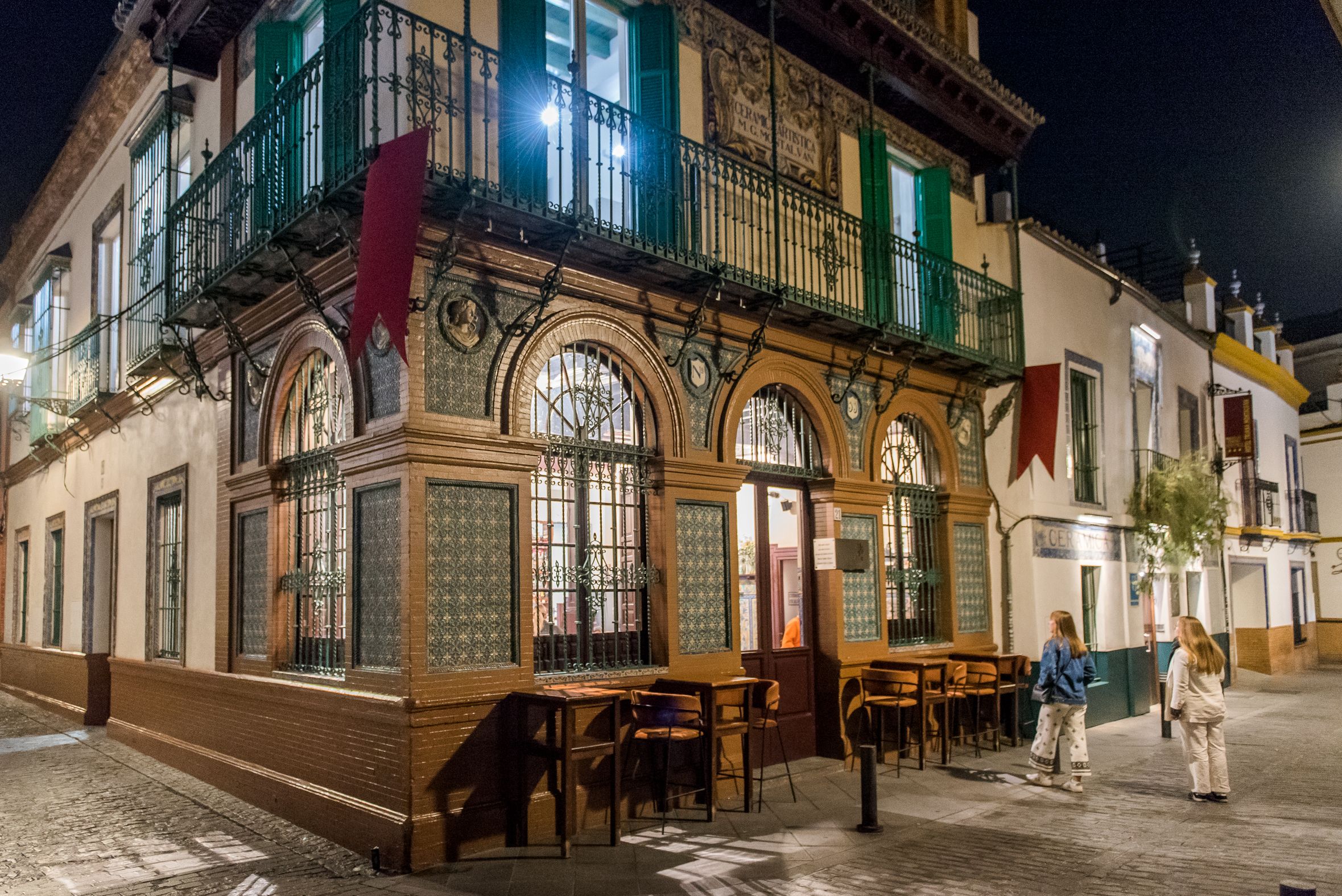 Hemos rozado Alfarería, adentrémonos un poco en esta histórica y larga calle que va desde el Patrocinio -¡ay aquellas gambas al ajillo de la taberna de Juan!- hasta San Jacinto. Si giramos hacia la derecha desde Paco España, antes de llegar al antiguo solar donde estaba el cine Alfarería de verano y estuvo después temporalmente el Mercado de Triana, podemos apreciar el edificio regionalista con influencia modernista de la antigua fábrica y tienda de Antonio Japón, otro de los importantes, cuyos reclamos en azulejos en la fachada datan de 1912, más de cien años los contemplan. Enfrente el bonito y peculiar estudio del artista colombiano, residente en Sevilla desde hace años, Norberto León, Norler, pintor muy original y espiritual y grabador también de paisajes artísticos sevillanos de gran belleza. La calle, hacia el otro lado, nos lleva hasta la vieja taberna Casa Diego, donde disfrutamos de sus caracoles y de sus guisos caseros hasta que, signo de los tiempos, el matrimonio propietario se jubila y el bar queda en manos también de la familia de Montalván y La Golondrinas, hoy reformado y con una buena nómina de tapas, siempre está lleno.
