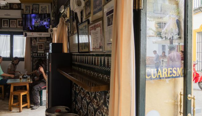Son muchos los bares cofrades que se inauguran en Sevilla, pero no tantos los que sobreviven. Uno de los templos está donde tiene que estar, junto a la Basílica del Gran Poder. Rodeando la plaza de San Lorenzo se encuentra una pequeña esquina que ni es muy grande, ni es pretenciosa, pero que aparece señalado en cualquier mapa de la ciudad. Entre sus cuatro paredes — aunque hay alguna más — no quedan ni dos centímetros libres. Todas están cubiertas por cuadros que hacen referencia a imágenes religiosas, la mayoría, de Semana Santa. Sólo rompen la regla algunas visitas estelares como miembros de la familia Borbón. Como los tiempos afectan a todo, también se pueden ver calcetines personalizados de 'Pepe Pinreles', con las típicas croquetas, sobre la barra o publicidad de una productora especializada en Semana Santa mientras en la tele se proyectan algunos de sus vídeos del Cristo de la Salud de San Bernardo.