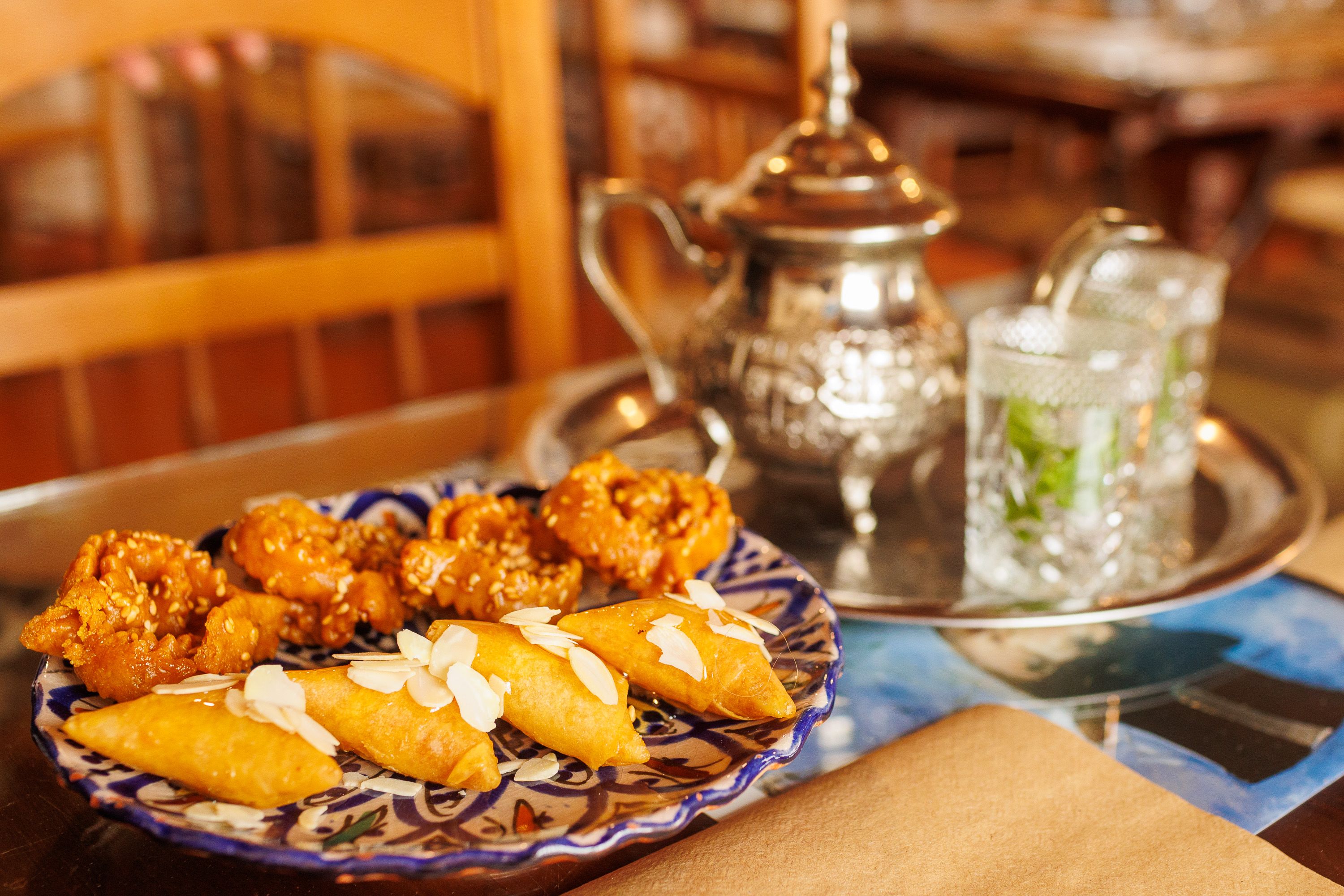 Los que gusten de postre tienen que confiar en la suerte. La elaboración del triángulo de almendra o de la shebakia precisan de una preparación tan cuidadosa y lenta que resulta imposible ofrecerlos a diario, ni siquiera semanalmente. Tienen días de elaboración previa. Están para las ocasiones. El primero conserva una crujientez o crujientismo en la hoja que parece imposible por el untuoso toque de miel. Pues lo tiene. El segundo es otra delicia con pasado común, tiene un cierto parecido al más exquisito pestiño en la masa trenzada. Es muy habitual en las célebres cenas de ramadán. El té, purísimo y sin pecado concebido, tiene la hierbabuena de la infancia como remate y decoración.