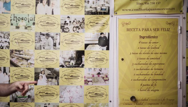 Lógicamente la cuarta generación de la familia Moreno también se ha visto envuelta en algunas anécdotas curiosas y emotivas. Una de ellas tiene como protagonista un cartel que cuelga en el patio donde puede leerse la receta para ser feliz y una dedicatoria a su autora, Sor Remedios, una monja que la había escrito en un libro. En 2015, cuando la confitería cumplió 125 años, pusieron por primera vez el museo en el que exponen artículos antiguos y recibieron gran cantidad de visitas. Entre ellas una vecina de Villamartín que quedó sorprendida al leer aquel pequeño texto. Resulta que Sor Remedios era su tía y hacía tan solo 5 meses que había fallecido. "Se hizo una foto con el cartel como recuerdo", añade el pastelero local.