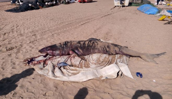 Un tiburón peregrino de más de tres metros de longitud ha aparecido muerto este pasado miércoles al mediodía en la playa de la barriada de los pescadores de La Antilla en Lepe (Huelva).
