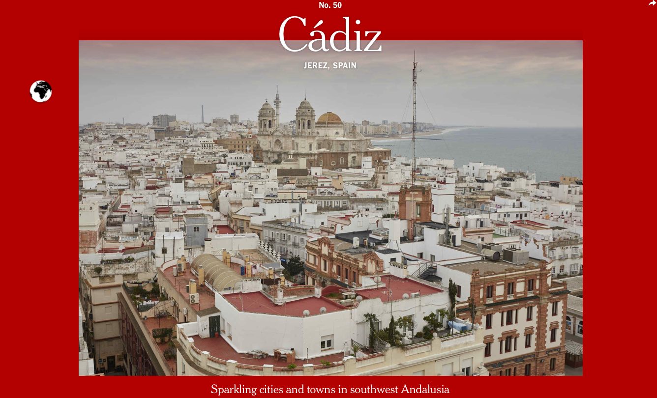 El diario estadounidense The New York Times publica su lista anual con los 52 destinos recomendados para viajar en 2019, entre los que destaca la provincia de Cádiz en el número 50, haciendo mención también a las ciudades de Jerez, Chiclana, El Puerto y Vejer, por su belleza, historia y potencia gastronómica. Es la primera vez que The New York Times destaca a la provincia gaditana en su lista, siendo esta la única provincia de España en estar presente en le selección de este prestigioso diario.