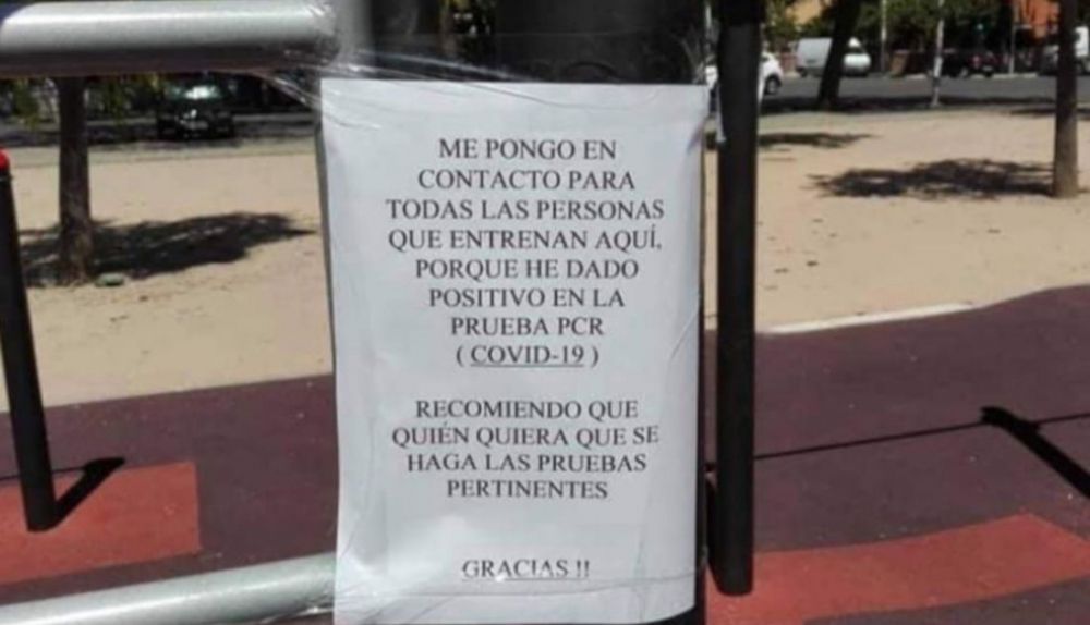 El cartel está puesto en cada uno de los equipamientos deportivos de la zona en la que presuntamente habría estado esta persona. El mensaje reza lo siguiente: "Me pongo en contacto para todas las personas que entrenan aquí porque he dado positivo en la prueba PCR (Covid-19). Recomiendo que quien quiera se haga las pruebas pertinentes. ¡¡Gracias!!".