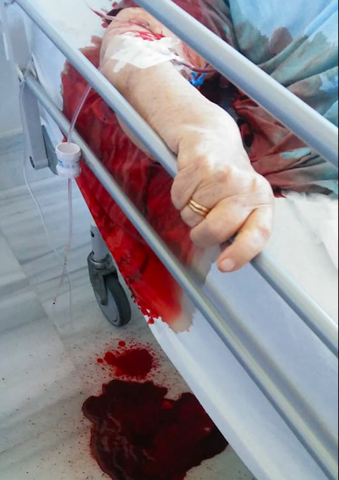 Las enfermeras del hospital Virgen Macarena dejan sangrando a una mujer sevillana de 89 años de edad durante más de tres horas. Así lo ha denunciado a lavozdelsur.es este miércoles su hija, Pilar Genaro. "Cuando llegué a las 8:00 de la mañana, me la encontré tal cual aparece en la foto. Fui a llamar a la enfermera, pero el compañero de habitación de mi madre me dijo que ya había alertado de su estado hasta en tres ocasiones", relata Pilar.