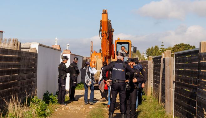 A las cuatro patrullas de la Guardia Civil se suman los funcionarios de la Junta, siete, todos con chalecos identificativos, la mitad con mascarilla sanitaria, gorra o gorro, gafas de sol. Aparece la Policía Autonómica, competente en materia de Territorio. Los que sufren el derribo se retiran resignados y compungidos.