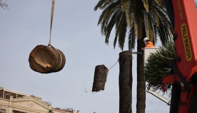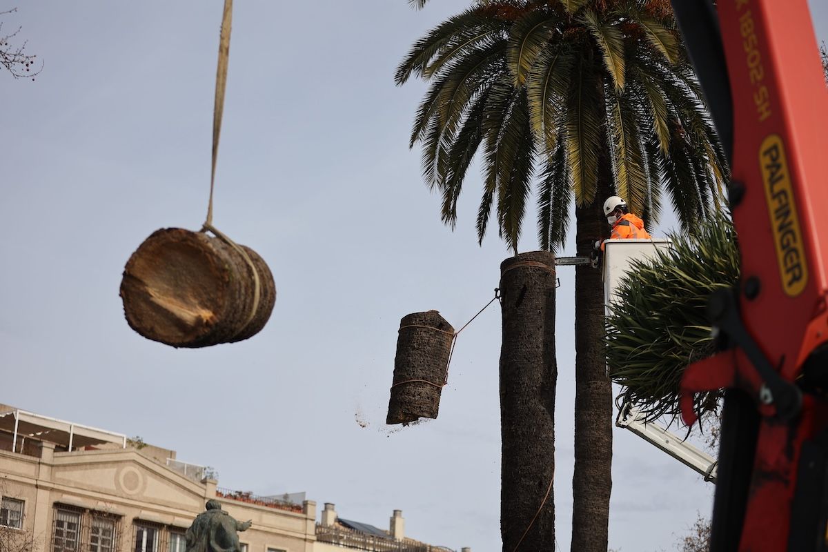 El fuste de esta palmera, que se murió hace unos meses, ha sido retirado este martes por parte de operarios municipales, que talan así a un ejemplar que no ha podido ser recuperado.