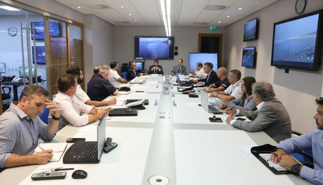 El capitán del Puerto, John Ghio, informó al grupo, presidido por el Ministro Principal, Fabian Picardo, y el gobernador, el vicealmirante David Steel, sobre la marcha de los acontecimientos. También asistieron el viceministro Principal, Joseph García, el ministro de Medio Ambiente, John Cortés, y el ministro del Puerto, Vijay Daryanani.