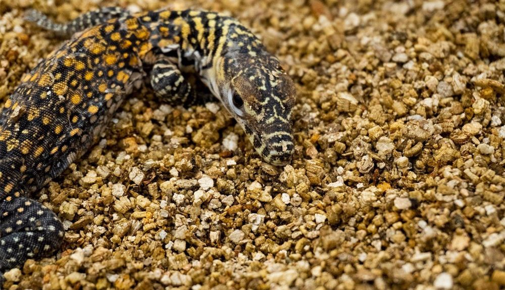 Al igual que sucede en el hábitat natural de esta especie, desde el momento en el que nacen, las crías viven separadas de sus padres y de forma totalmente independiente. Este comportamiento es respetado, manteniendo a los pequeños en terrarios separados. Durante estas primeras semanas de vida, el equipo de cuidadores debe controlar de cerca la alimentación de cada uno de ellos, y su estado de salud.