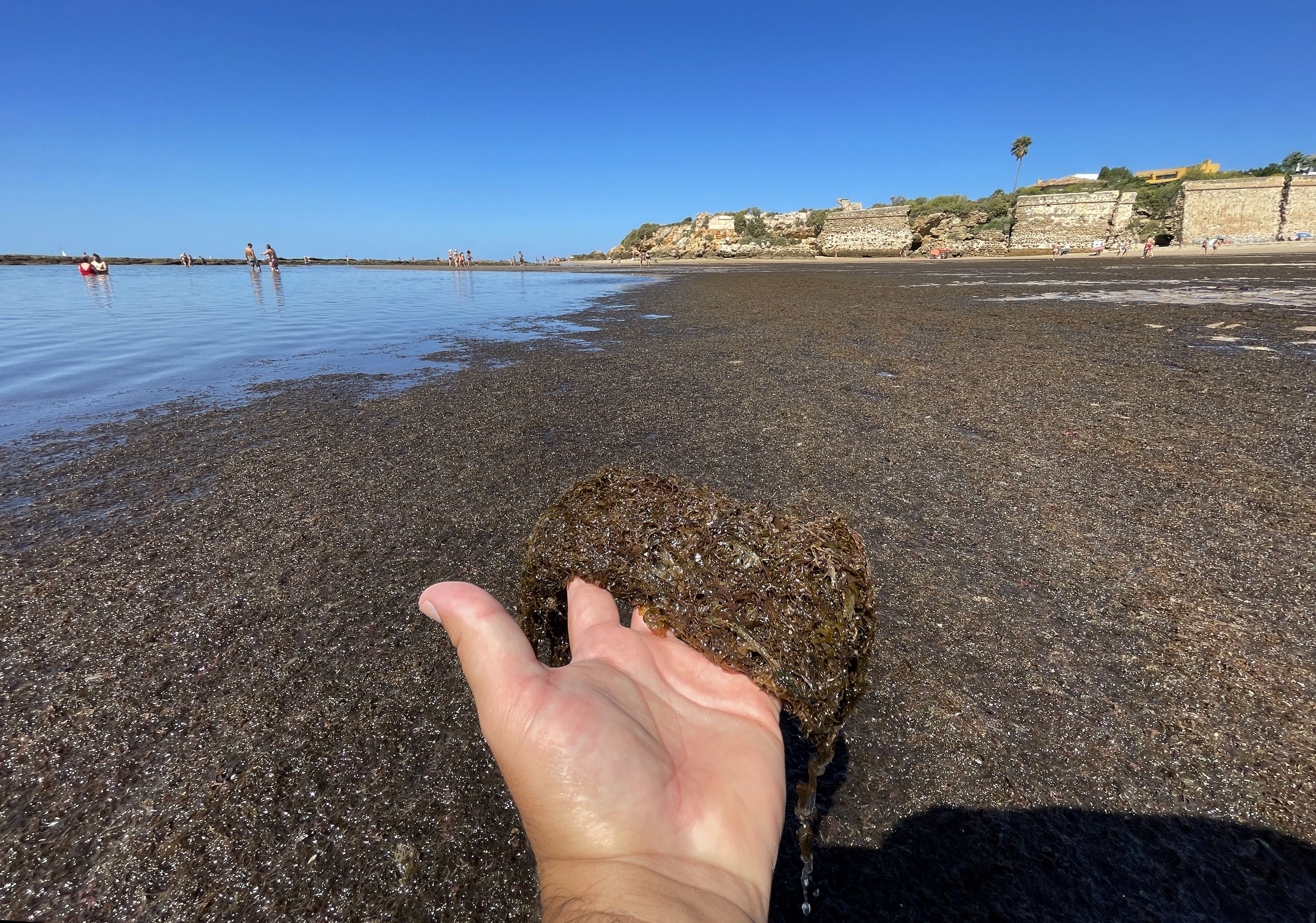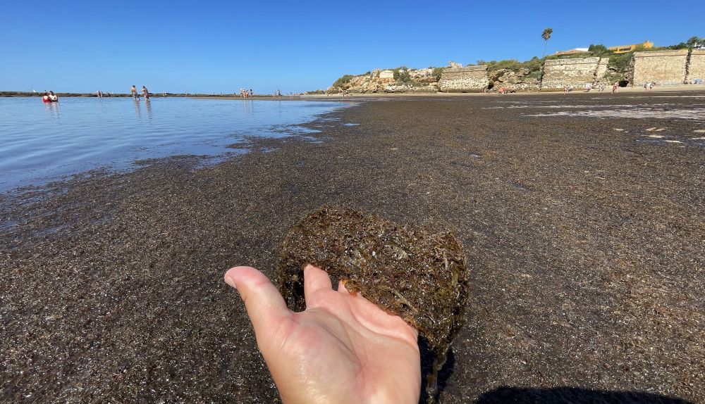 Estos días se están viviendo mareas muy altas, con coeficiente elevado, que provocan que las algas se queden en la arena. No obstante, es un problema que se viene repitiendo durante todo el verano y hasta que no cambie la marea y el viento, volverá a repetirse durante el fin de semana. "Llegan hasta la cintura, no nos podemos bañar", comenta una señora a lavozdelsur.es.