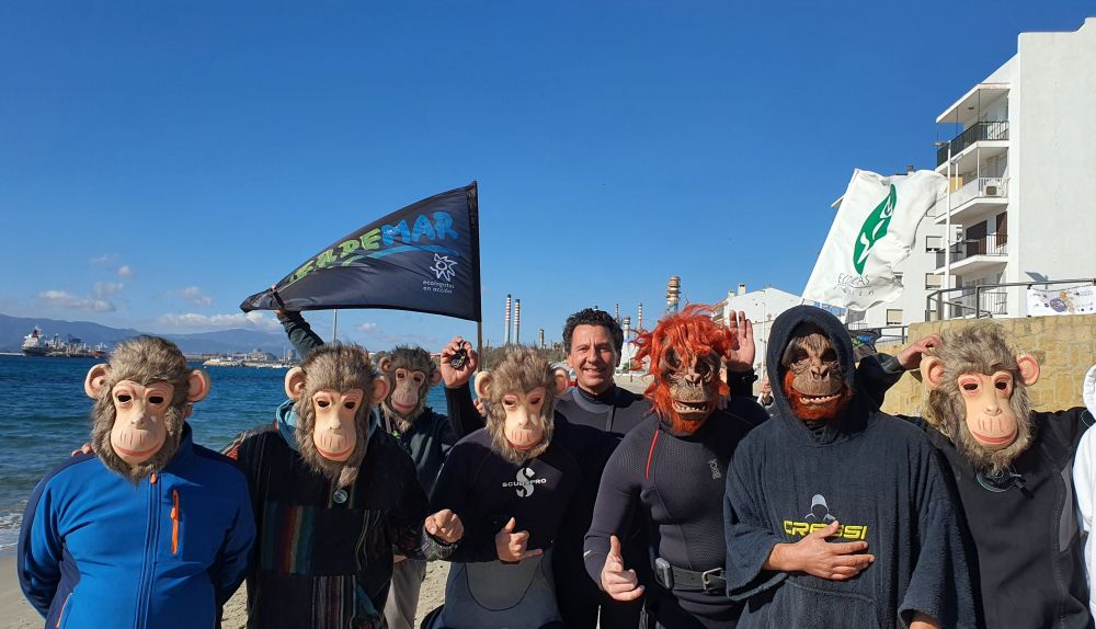 Buzos simulando al orangután de Borneo han llevado a cabo una protesta submarina desplegando una pancarta en los fondos del mar de la Bahía de Algeciras, junto a la refinería de Cepsa Gibraltar. El lema de la protesta ha sido "#SiEsPalmaNoEsBio Save Our Rainforest".
