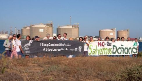 En la otra orilla de la ría de Huelva, dentro del Paraje Natural Marismas del Odiel, los ecologistas han desplegado sus pancartas. “Stop a los combustibles fósiles y stop al lavado verde” son algunas de las consignas que se han desplegado frente a numerosos macrotanques de gas licuado que colmatan gran parte de los terrenos del puerto exterior de Huelva. También se recuerda la negativa al almacenamiento del gas en Doñana, amenaza adicional no resuelta para el espacio natural tan valorado y con serias dudas de futuro.