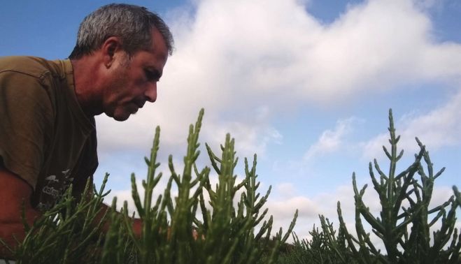 Cada día se encarga durante unas dos horas del riego de la plantación mediante un sistema de goteo y está siempre atento a los cambios de mareas. Cuando está vacía debe aportarles agua salada para su crecimiento. “Nuestra actividad no afecta a las poblaciones locales de salicornia, sino todo lo contrario, siempre hay una dispersión de semillas que favorece que haya más salicornia por la zona”, comenta Manuel, que combina esta labor con su trabajo como coordinador de la base de Cruz Roja de la localidad. “Llevo una embarcación de salvamento marítimo, de momento, hay que compaginarlo con lo que te da de comer”, expresa.