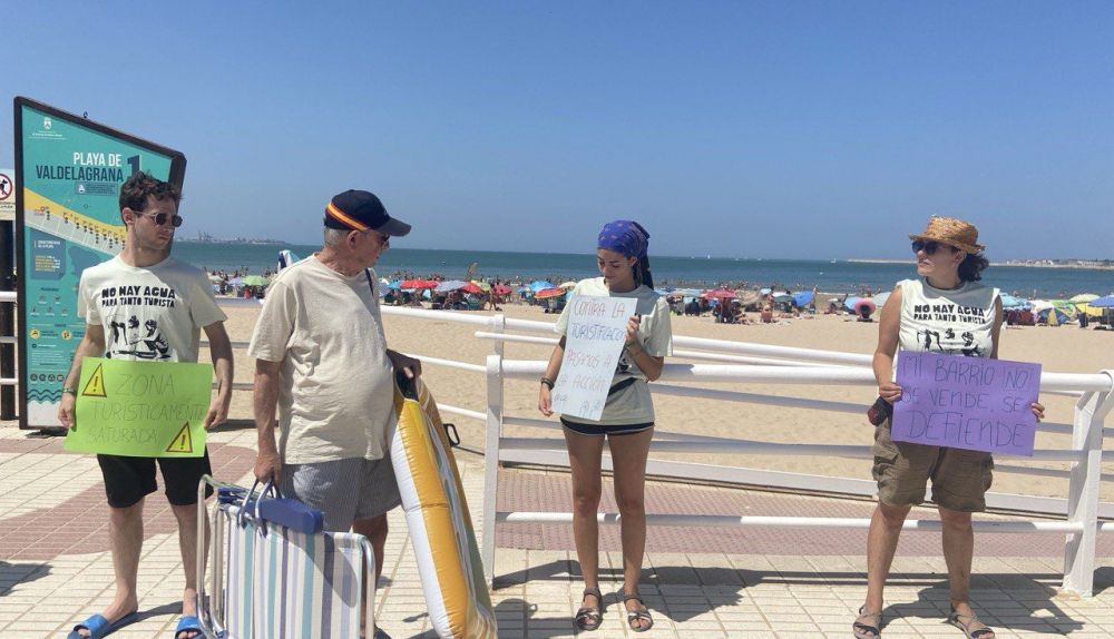 "No hay agua para tanto turista", "El turismo vive de nosotras" o "Fuera de Cádiz Airbnb". Estos son algunos de los mensajes que se han leído este sábado en la cadena humana que ha tenido lugar en la playa de Valdelagrana, una zona que ha sufrido una masificación turística desde hace años, según denuncia Ecologistas en Acción, organizador del evento.