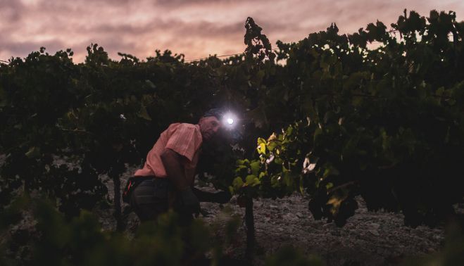 Hay movimiento en el Cortijo de Torrecera, de la bodega Miguel Domecq, en plena campiña de Jerez. Las cuadrillas comienzan a cortar las primeras uvas de cepas de chardonnay, el suministro de las distintas marcas de la casa que se ‘alimentan’ de esta variedad, en especial el Entrechuelos Chardonnay. Se trabaja de noche, para cuidar a todos: tanto al fruto, que se ‘estresa’ con el calor que hace durante el día mediado el verano, como a las personas, para evitar un posible golpe de calor.