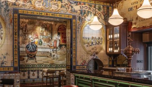Bueno, y a todo esto, ¿qué tienen Los Gabrieles, qué le hace ser un sitio especial si le estamos echando un vistazo desde Jerez? Pues probablemente la mejor colección de azulejos de España si hablamos de la hostelería. Muchos de esos azulejos están vinculados a las bodegas del Marco de Jerez y otras empresas señeras de Andalucía (caso de Sánchez Romero Carvajal). Fue poco después de su apertura, en los años 20 y 30, cuando comenzó a sumar azulejos, algo que siguió haciendo en la posguerra, hasta el punto de que se puede decir que se trata de un local (la parte clásica) que está prácticamente alicatado... de hecho, es común oír hablar de este local como la 'capilla sixtina' de la azulejería en España.