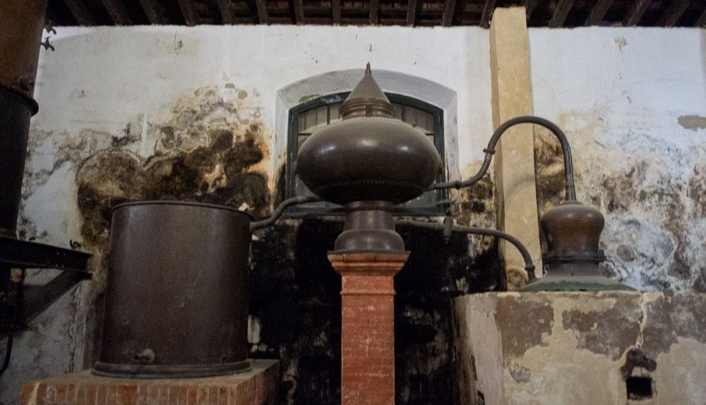 Un aspecto singular caracteriza a estos alambiques: su fabricación en cobre. Esta ayuda al calor, como buen conductor térmico, y a su maleabilidad, que puede dar a formas como la de las diferentes piezas de estos instrumentos imprescindibles para la destilación: el capital, la cabeza de moro o la oliva, como también se le suele denominar por su parecido a una aceituna. "El cobre además redondea en su fragancia", añade Trillo. A su lado, se encuentran otros alambiques de décadas posteriores, concretamente de finales del XIX. Es el alambique de platos, también originario de Francia, que daba como resultado un grado de alcohol más elevado, casi rozando los 80 grados, con una capacidad de unos mil litros.