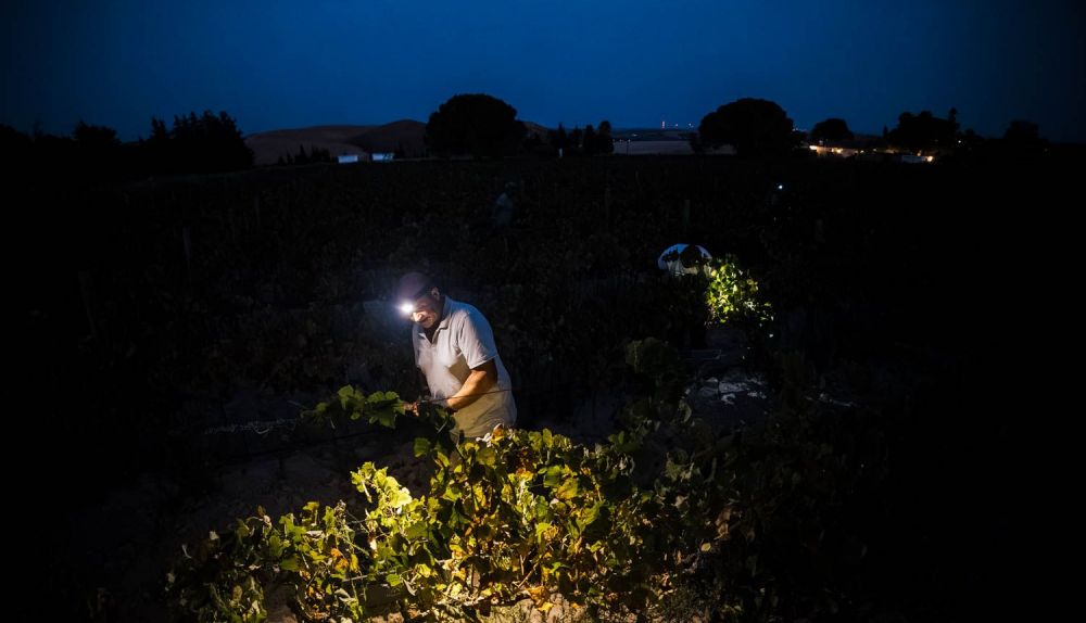 Definitivamente, ha caído la noche y los cortadores siguen a lo suyo a un ritmo impresionante, ya con el apoyo de la luz de 'minero' en la cabeza. Ha sido bautizada como una unidad de élite y lo demuestra. Así de simple. Paseamos por los liños con Santi Jordi, con el que rememoramos el comienzo de los tintos en la provincia de Cádiz, que son más de 400 hectáreas; hablamos de los pioneros, de Regantío y Páez Morilla –Páez Morilla y Regantío–; del interés de la Junta a partir de mediados de los 90 por dotar a Andalucía de tintos de calidad, las experiencias llevadas a cabo, las uvas que mejor se han adaptado –desde su punto de vista, la syrah viene a ser algo así como 'la tempranillo del sur'–, de la trayectoria del propio Jordi en estos años y los reconocimientos que ha obtenido (el último, la presencia de sus vinos en el banquete de la pasada cumbre de la ONU en Sevilla)...