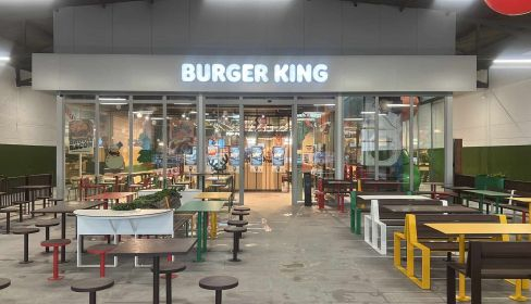 El restaurante cuenta con imagen Royal de Burger King España, una decoración en la que destaca el uso del roble blanco con matices suaves que permiten enmarcar el conocido lema de la cadena Home of the Whopper, creando así un entorno confortable y agradable. Además, la combinación de cemento y ladrillo negro, junto con las instalaciones vistas y la iluminación enmarcan un estilo idóneo para la rotulación y los muebles de diseño vibrante y colores vivos de la sala. De este modo, el restaurante se convierte en un espacio único con una variedad de asientos para que los clientes elijan dónde disfrutar de las icónicas hamburguesas a su manera, siguiendo el lema de los orígenes de la marca Have It Your Way.