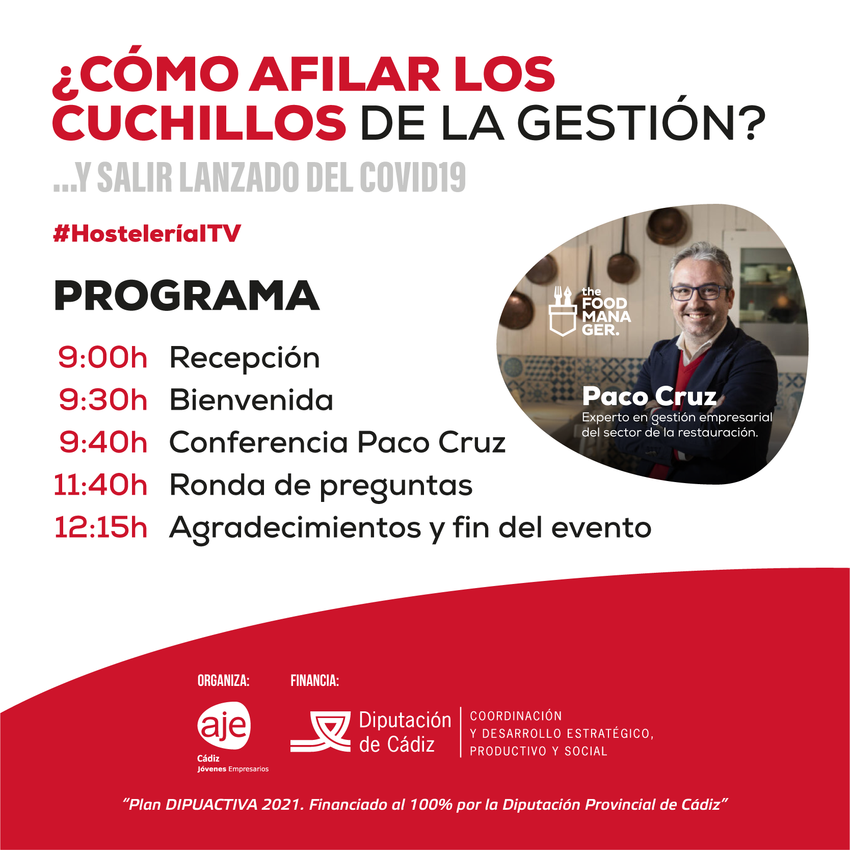 Esta iniciativa organizada por AJE Cádiz y financiada por Diputación de Cádiz se celebrará de forma virtual o presencial en el Parador de Turismo de Cádiz. Paco Cruz va a pasar la ITV de los negocios de hostelería con el objetivo de que los empresarios del sector optimicen recursos y hagan rentables sus negocios. The Food Manager, experto en el sector de la restauración, chequeará varios puntos fundamentales para que una empresa de restauración salga rentable con los que se comprobará en qué punto se encuentran los negocios y ver en qué y cómo se puede mejorar.