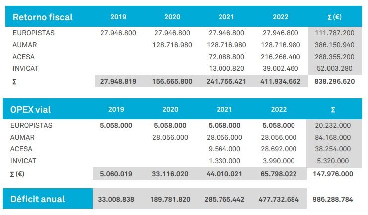 A pesar de la drástica reducción ocurrida en la red nacional de autopistas de peaje, los 2.161 kilómetros en actual operación generan anualmente 1.982 empleos directos y 460 millones de euros al año de recursos públicos, que se desagregan en 330 millones anuales e retorno fiscal (ingresos públicos por recaudación de IVA, IBI y Sociedades), y 130 millones de ahorro de gasto público en conservación.