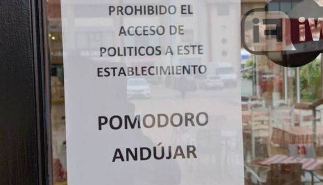 El restaurante Pomodoro de Andújar prohibe la entrada a políticos y la Policía Local les obliga a retirar los carteles.