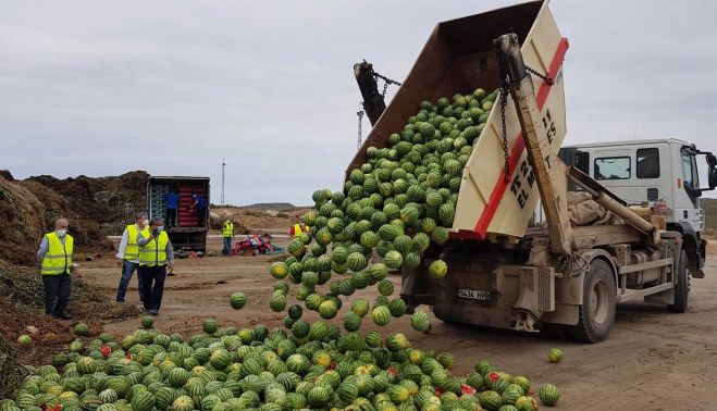 La Asociación de Organizaciones de Productores de Frutas y Hortalizas de Almería (Coexphal) ha tirado este viernes más de 150.000 kilos de melón y sandía apta para el consumo a través de dos actos simbólicos en Vícar y Níjar como una "acción desesperada" para protestar por la "ruinosa campaña" que atraviesa el sector hortofrutícola en una semana en la que los precios están "por debajo de los 40 céntimos de euro el kilo de sandía y 0,25 euros el kilo de melón".
