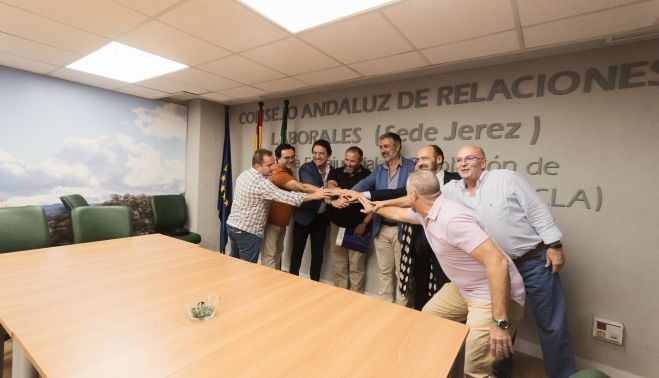 El delegado territorial de Empleo, Empresa y Trabajo Autónomo, Daniel Sánchez Román, ha presidido este lunes en la sede jerezana del Sercla (Sistema Extrajudicial de Resolución de Conflictos Laborales de Andalucía), situada en la Alameda Cristina, la firma del acuerdo sobre el XXVI Convenio de la Vid.