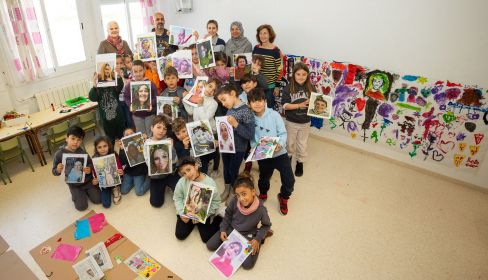 “Estoy cogiendo flores y pegándolas en esta foto, donde salgo con mi mamá Tamara”, dice Valeria, que la ha escogido porque “me gusta mucho estar con ella, la echaba de menos y quería acordarme de ella”. A su lado, Álex coloca una hoja en el margen del folio impreso con el rostro de Fátima, su madre. Laura hace lo mismo con un trozo de algodón de colores.
