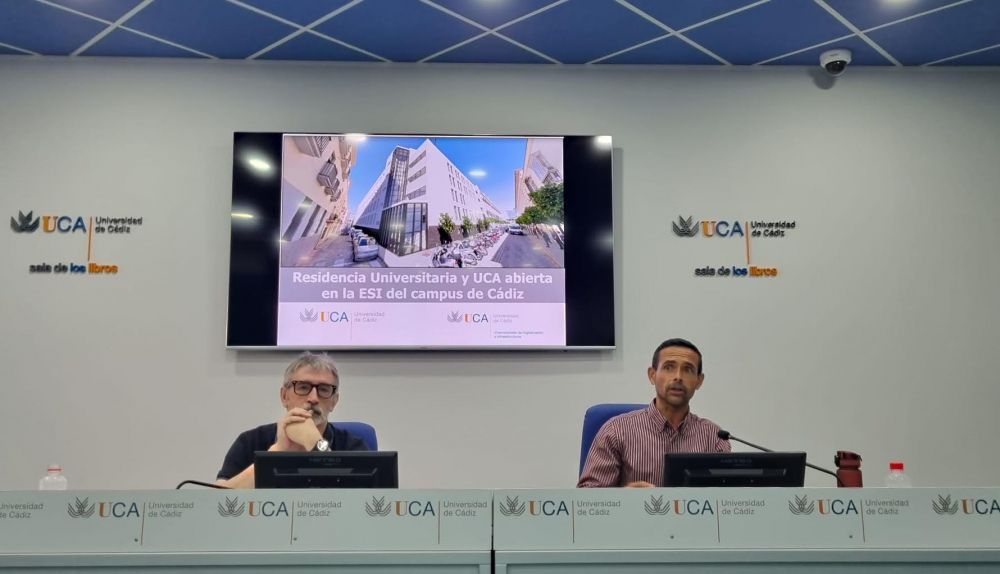El rector de la Universidad de Cádiz, Francisco Piniella, en compañía del vicerrector de Digitalización e Infraestructuras, Carlos Rioja, ha presentado hoy el anteproyecto de nueva residencia universitaria y centro cultural abierto en el edificio de la antigua Escuela Superior de Ingeniería en el Campus de Cádiz. Se trata de “una iniciativa que forma parte de la estrategia de fortalecimiento de la UCA en sus cuatro campus y que se incluye dentro del plan propio de mejora de sus infraestructuras”.