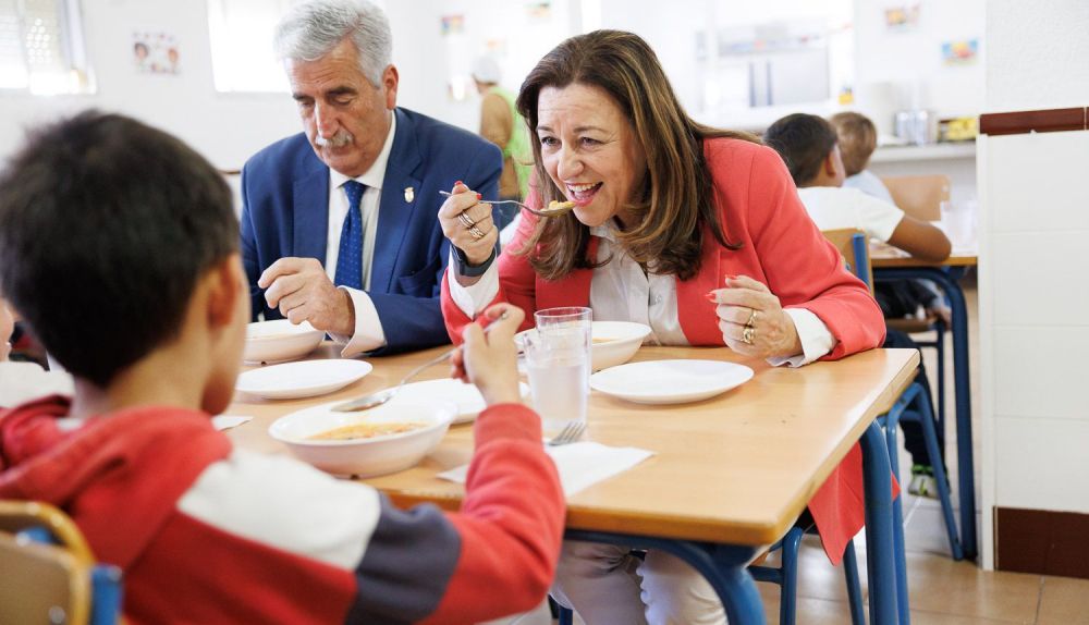 Alubias, tortilla de calabacín, ensalada y, de postre, manzana. Es el menú que el alumnado del CEIP Los Argonautas de Chipiona ha comido este lunes en el comedor escolar del centro. Y también la consejera María del Carmen Castillo. Y el alcalde chipionero, Luis Mario Aparcero.