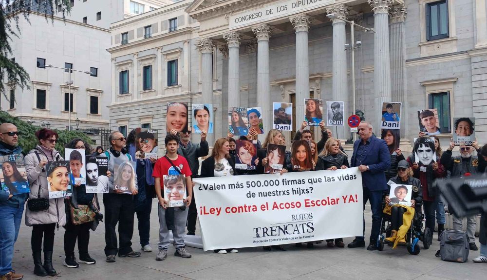 Convocadas por la Asociación Trencats Contra la Violencia en las Escuelas, decenas de familias se concentraron este jueves frente al Congreso de los Diputados en Madrid, coincidiendo con el Día Internacional contra la Violencia y el Acoso Escolar. Bajo el lema “¿Valen más 500.000 firmas que las vidas de nuestros hijos? ¡Ley contra el acoso escolar ya!”, los manifestantes reclamaron la aprobación urgente de una legislación estatal que prevenga y erradique esta forma de violencia que, denuncian, sigue cobrándose vidas infantiles y juveniles.