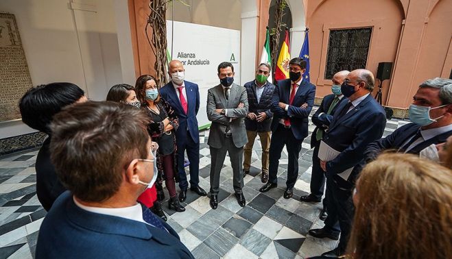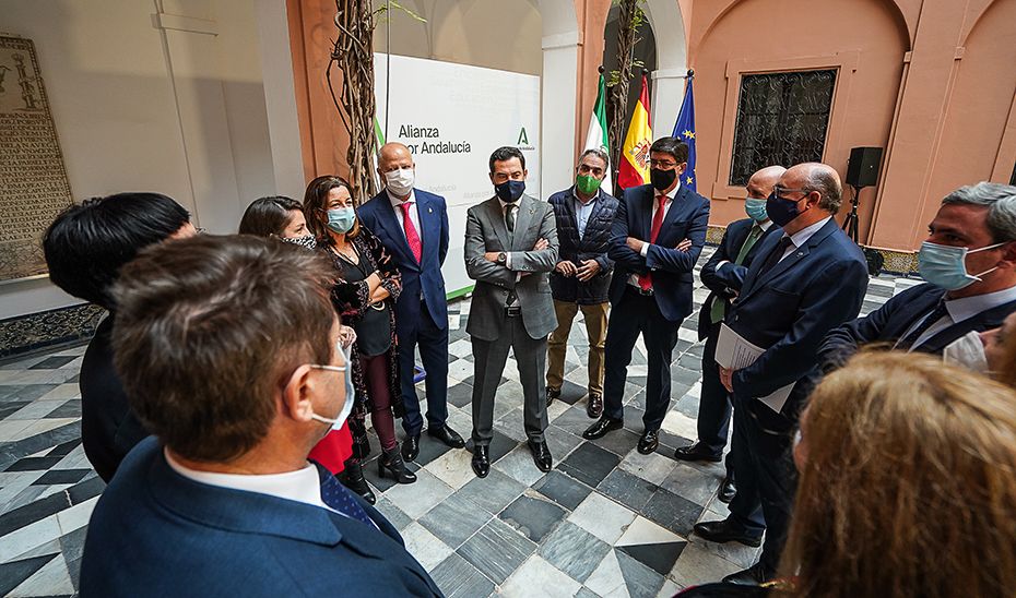 El presidente de la Junta de Andalucía, Juan Manuel Moreno, ha presidido este pasado martes la firma del acuerdo entre la Consejería de Educación y Deporte y organizaciones patronales, titulares y sindicatos para reforzar las plantillas docentes de los centros educativos concertados en más de 300 nuevos profesores y profesoras para el curso 2020/21, a sumar a los 970 ya incorporados por el acuerdo del mes de agosto pasado.