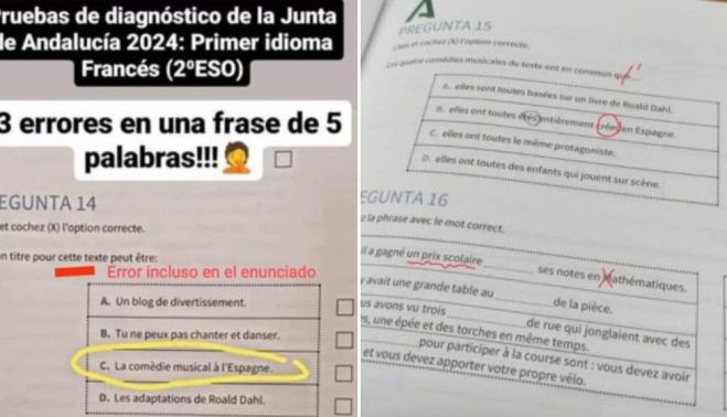 "Tres errores en una frase de cinco palabras", denuncia sobre el examen para 2º de la ESO. En efecto, la palabra 'comédie' aparece con la tilde de acento grave (`), cuando en realidad es el agudo (´). Y sería 'musicale', no 'musical', por ejemplo.