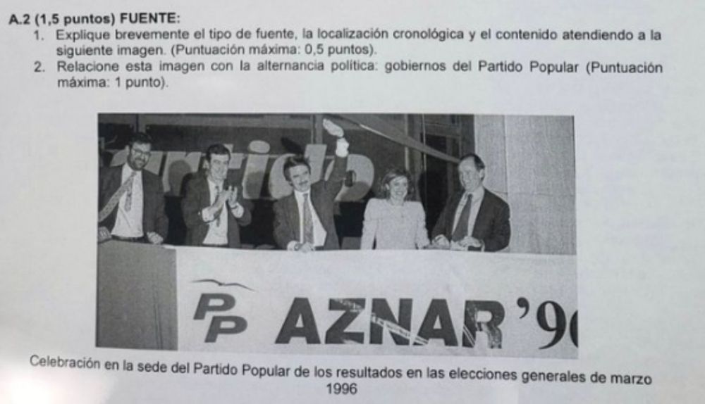 Unos exámenes que están dejando llamativas curiosidades. En la prueba de Historia de la Comunidad de Madrid, José María Aznar y Francisco Franco se han convertido en dos de los protagonistas. En una de las preguntas aparece una foto en la que Aznar celebra, desde el balcón de la calle Génova, la victoria conseguida por el PP en 1996. "Relacione esta imagen con la alternancia política: gobiernos del Partido Popular" es el enunciado de la pregunta en cuestión. Responder correctamente se traducía en 1,5 puntos.