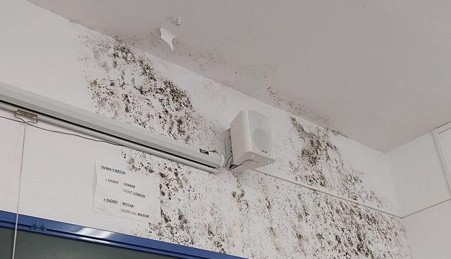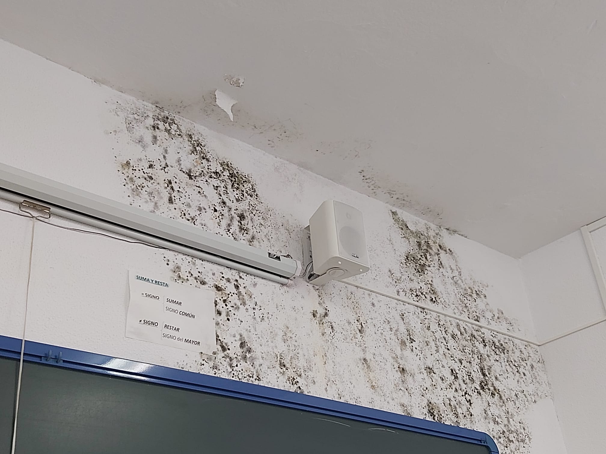 El interior de este colegio para personas adultas también ofrece un aspecto lamentable. "El estado interior es aún más patético. A la histórica falta de ascensor, que condiciona la accesibilidad de la planta superior para personas con movilidad reducida, se suman las múltiples filtraciones, goteras y las manchas de humedad y de mohos que convierten la estancia en esas clases en auténticos desafíos a la salud del profesorado y del alumnado", señala este maestro jubilado.