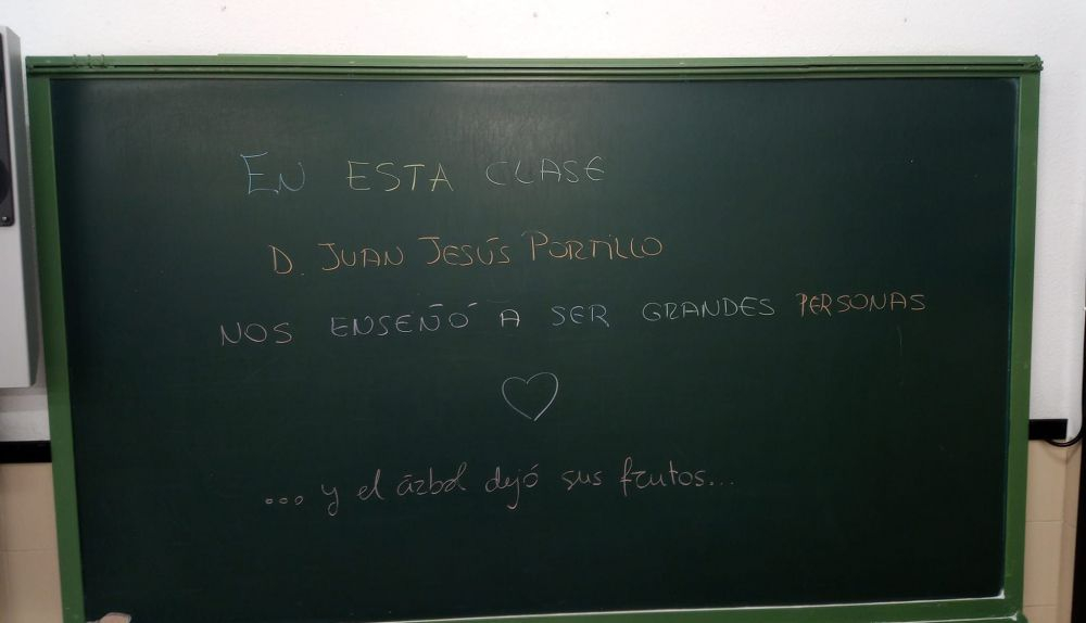 Otro docente de la localidad serrana, Juan Jesús Portillo Ramos, se ha llevado una gran sorpresa en su despedida del IES Las Lomas, tras varios meses de trabajo. "En esta clase, D. Juan Jesús Portillo nos enseñó a ser mejores personas... y el árbol dejó sus frutos", le han escrito sus alumnos en la pizarra de clase.