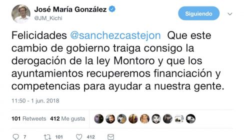 En Cádiz, uno de los llamados alcaldes del cambio, José María González Kichi, ha publicado en su cuenta de Twitter la correspondiente felicitación y ha demandado: "Que este cambio de gobierno traiga consigo la derogación de la ley Montoro y que los ayuntamientos recuperemos financiación y competencias para ayudar a nuestra gente".