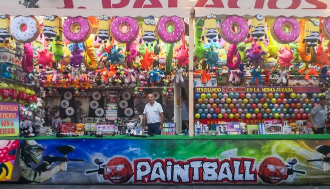 Juan y sus tres hermanos se criaron “debajo del mostrador” de la tómbola que su padre llevaba de feria en feria. Sus padres se conocieron en Almería, precisamente durante unas fiestas, se casaron e iniciaron una vida juntos en torno a un medio de vida que luego han heredado algunos de sus hijos. “Somos cuatro hermanos, el mayor y la pequeña montaron una cafetería hace unos años porque estaban hasta las narices de feria, porque esto agota mucho. Quedamos hermano Pepe y yo”, relata Juan Palacios, miembro de la Asociación de Industriales Feriantes de Andalucía, Ceuta y Melilla. Él regenta varios puestos de juegos y su hermano, atracciones infantiles. “Esto tiene veneno. Es una vida complicada pero muy bonita”, explica Juan. “Más que veneno es vida, ese nerviosismo, ese estrés bonito…”, se corrige luego.