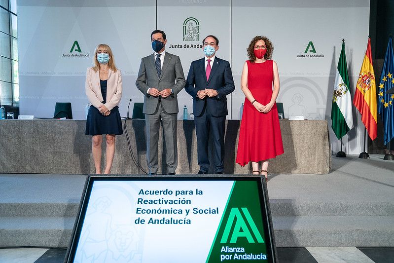 Los tres actores firmantes del Acuerdo para la Reactivación Económica y Social de Andalucía con el Gobierno andaluz, la Confederación de Empresarios de Andalucía y los sindicatos UGT-A y CCOO-A, han coincidido este jueves en calificar el pacto como "un gran acuerdo" o "más que un acuerdo, un compromiso", en palabras de las secretarias generales de los sindicatos, Carmen Castilla y Nuria López, quienes han avisado de que "no es un cheque en blanco ni al Gobierno ni a la patronal".