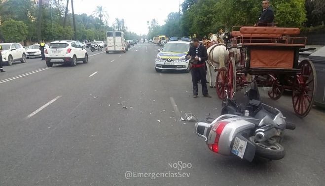 Un motorista de unos 28 años de edad, y que superaba el cuádruple de la tasa máxima de alcoholemia, ha quedado herido leve tras chocar con un coche de caballos en la avenida de la Palmera de la ciudad de Sevilla.