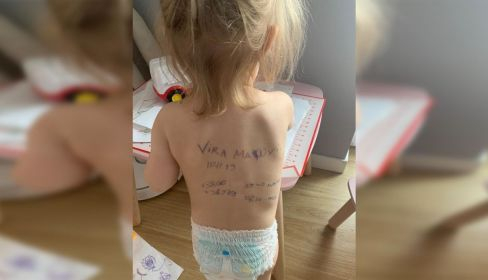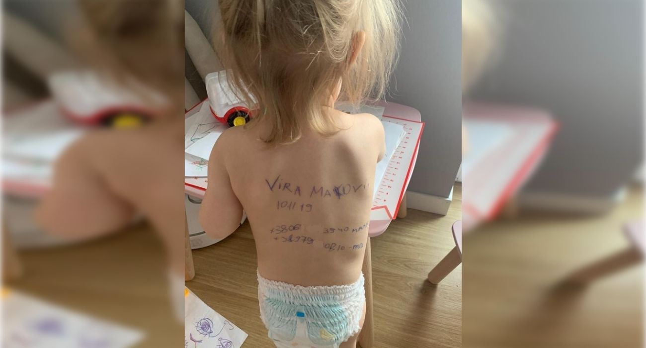 "Lo firmé con mis manos, temblando mucho", ha confesado Aleksandra Makoviy, una de esas madres ucranianas que puso sus datos con bolígrafo en la espalda de su hija Vera.