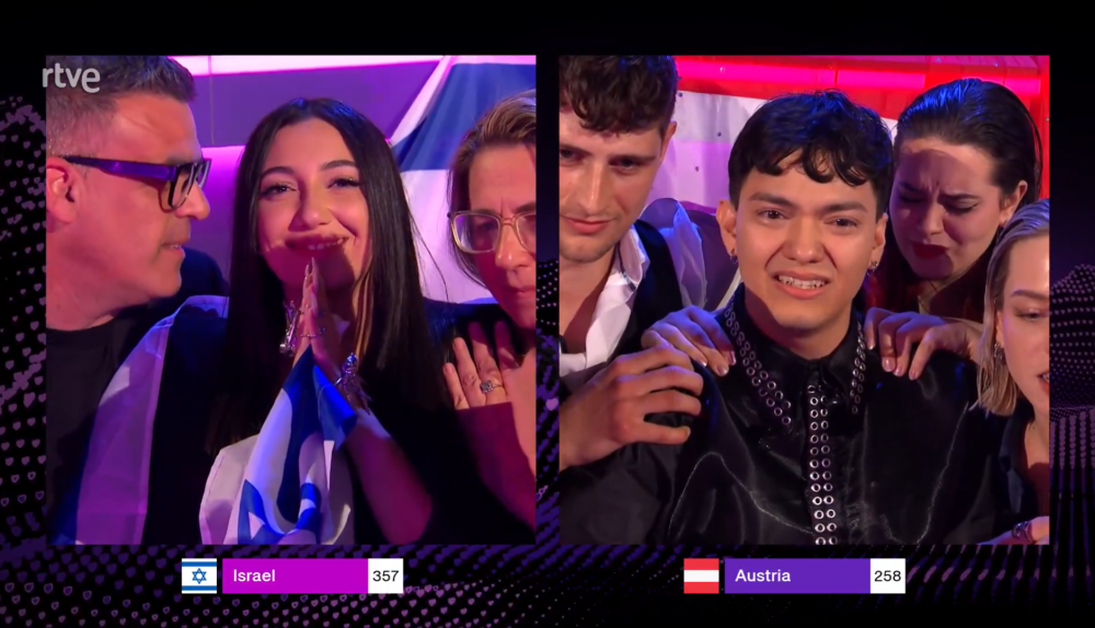 Y es que los jurados profesionales dejaron a Israel en mitad de la tabla. Sin embargo, su representante estuvo a punto de ganar el micrófono de cristal. Sólo Austria pudo evitarlo en el último suspiro y lo hizo gracias a la renta que tenía del voto profesional. Israel fue la favorita del público en toda Europa. Seguramente gracias a aquellos que votaron a modo de 'trolleo' para fastidiar al movimiento propalestino que ha surgido en algunas delegaciones y entre el público, donde se mostraron banderas palestinas. Además, la organización silenció el sonido ambiente durante la canción israelí para tapar los abucheos.