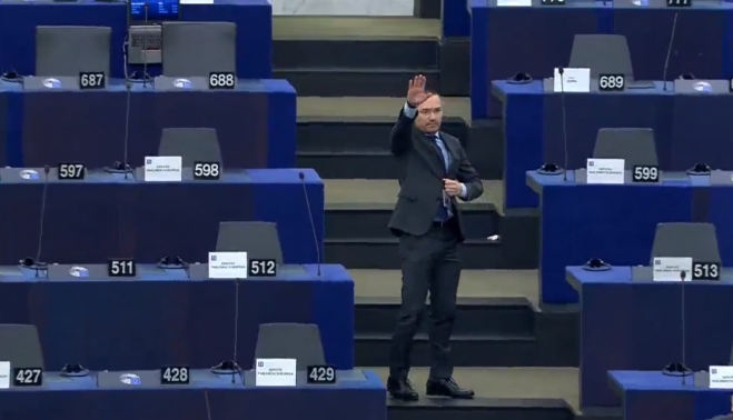 Parce qu'il a défendu l'état de droit en 🇪🇺, @sandrogozi s'est fait insulter par l'eurodéputé @djambazki, qui a quitté l'hémicycle en faisant un scandaleux salut nazi.