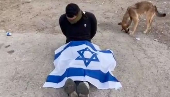 Con las víctimas atadas de brazos, los secuestradores les obligan a bailar y le entregan una bandera israelí para que griten "¡viva Israel!".