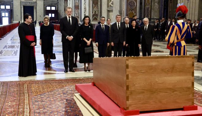Los Reyes, ante el féretro de Su Santidad el Papa Francisco, junto a la delegación española.