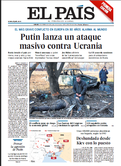 En El País se puede leer que se trata del conflicto más grave en Europa en 80 años y continúa con el siguiente titular: "Putin lanza un ataque masivo contra Ucrania".