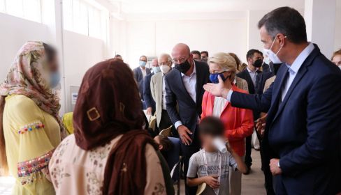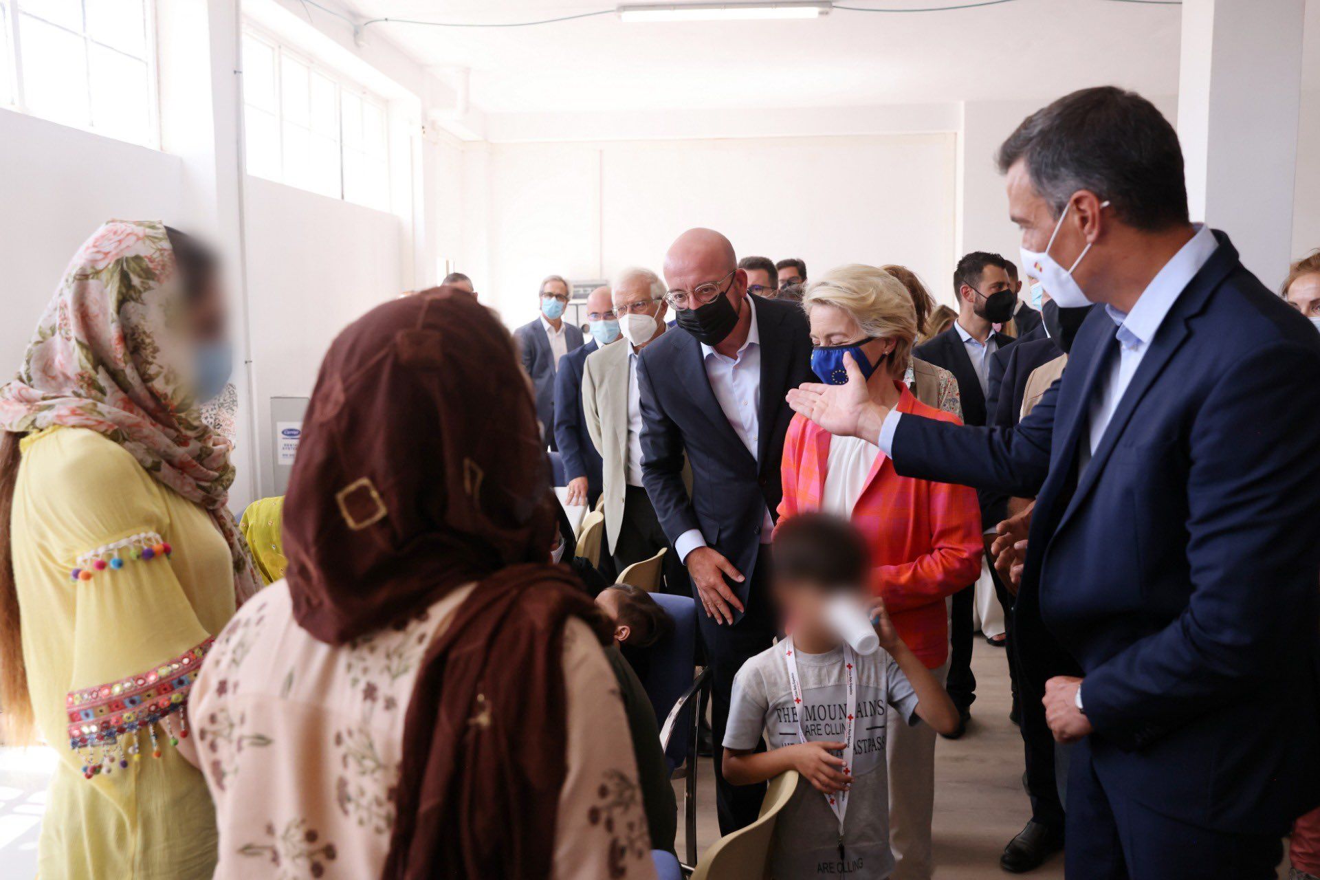 A la visita de Sánchez, Von der Leyen y Michel al campamento temporal para desplazados afganos se han sumado también el alto representante de Política Exterior de la UE, Josep Borrell, los ministros de Asuntos Exteriores, Unión Europea y Cooperación, José Manuel Albares, y el ministro de Inclusión, Seguridad Social y Migración, José Luis Escrivá.