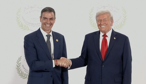 Durante el acto, Sánchez se acercó al escenario donde aguardaba Trump. Ambos se estrecharon la mano con un gesto sonriente; el presidente estadounidense incluso acompañó el saludo con una palmada amistosa, en un gesto que buscó transmitir cordialidad pese a la reciente tensión diplomática.