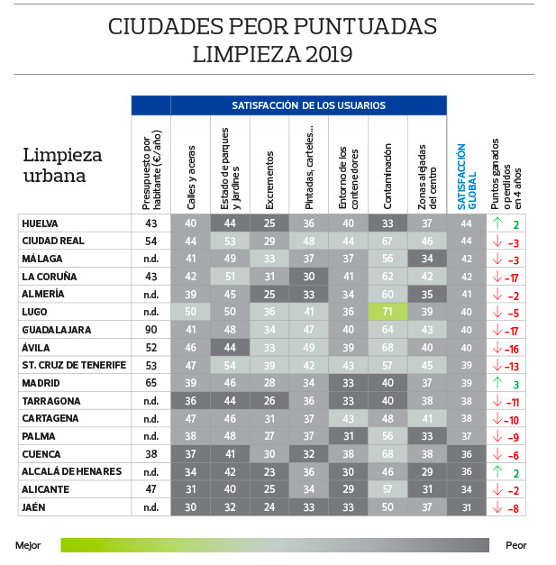 Al contrario, las tres ciudades que lideran el ránking son: Oviedo, Bilbao y Vigo, localidades que se han rascado el bolsillo para brillar, que han gastado en campañas de concienciación y han renovado su flota de limpieza. Cabe destacar también que el informe revela que hasta 39 de las 60 ciudades analizadas han empeorado su calificación.