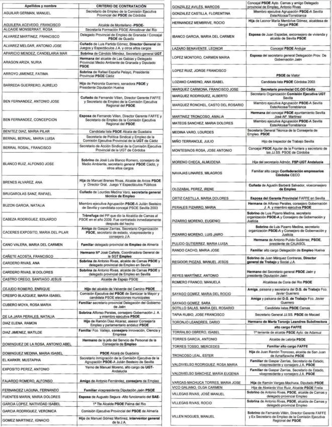 El Sindicato Andaluz de Funcionarios, como publicaba El Mundo esta semana, ha recopilado los nombres y apellidos de 85 trabajadores de la Faffe y sus vinculaciones con el PSOE, "sin descartar que el número de enchufados pueda ser notablemente superior". Como confirma este diario, un atestado de la Unidad Central Operativa (UCO) de la Guardia Civil sobre la Faffe revela que han encontrado unos 200 empleados vinculados al PSOE en esta fundación de la Junta, si bien el informe no enumera nombres y apellidos. Para el SAF, "estas contrataciones podrían ser constitutivas de presuntos delitos continuados de prevaricación administrativa, cohecho y tráfico de influencias".